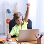 Mergina žiūrinti į nešiojamojo kompiuterio ekraną