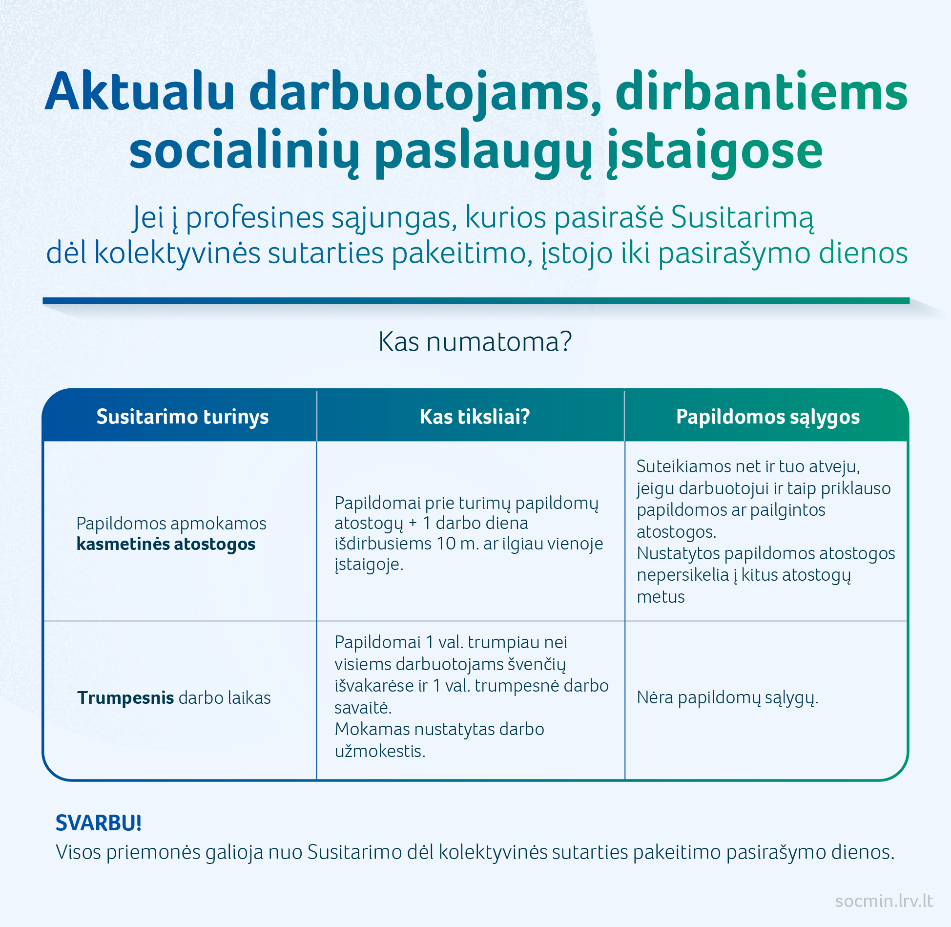 Socialinių paslaugų įstaigų darbuotojai, priklausantys profesinėms sąjungoms, per metus galės pasinaudoti papildomomis apmokamomis kasmetinių atostogų dienomis. Profesinių sąjungų nariai taip pat turės viena valanda trumpesnę darbo savaitę, o mokama jiems bus kaip už visą darbo laiką. Visa tai įtvirtinta socialinės apsaugos ir darbo ministrės Monikos Navickienės kartu su penkiomis socialinių paslaugų srities darbuotojų profesinėmis sąjungomis pasirašytame Susitarime dėl socialinių paslaugų šakos kolektyvinės sutarties pakeitimo.