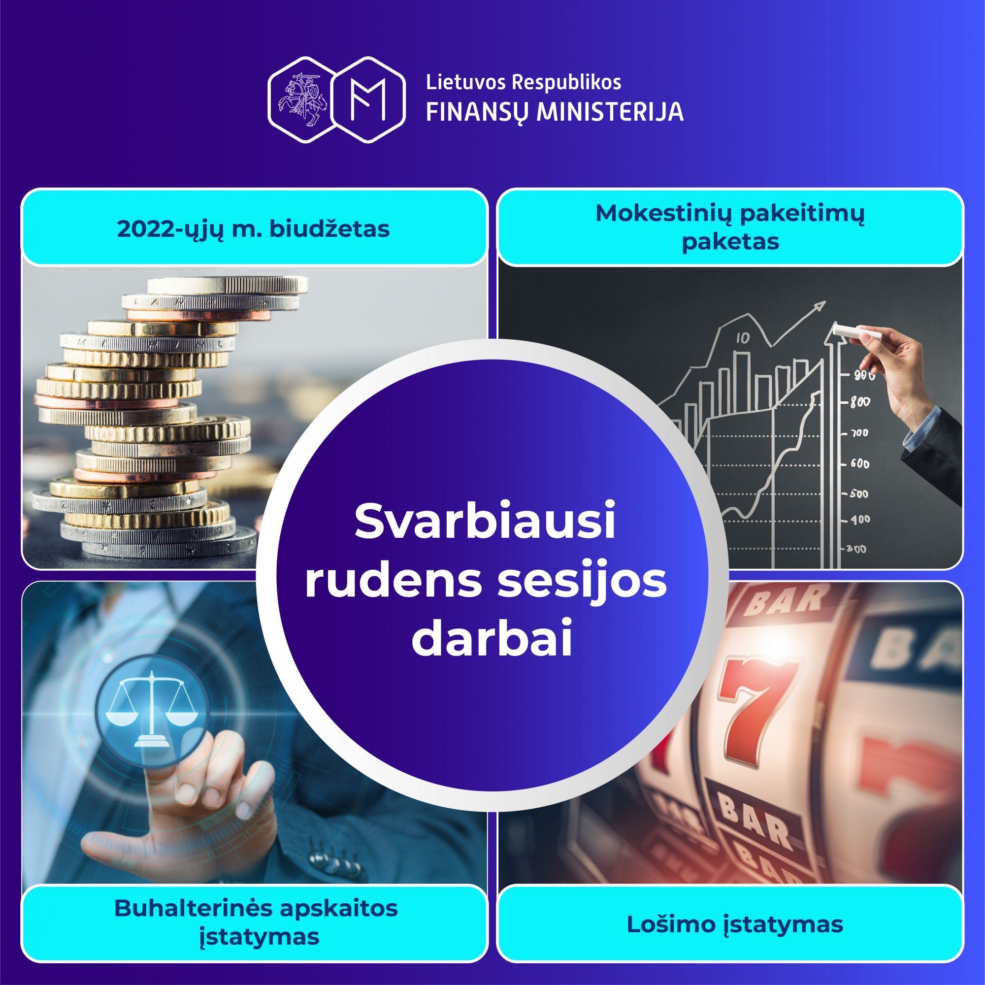 Penktadienį prasidedant naujajai Seimo plenarinių posėdžių rudens sesijai, Finansų ministrė Gintarė Skaistė pažymi, jog laukia intensyvus ruduo, kurio kertinė ašis – būsimas 2022 m. biudžetas. Anot ministrės, be 2022 m. valstybės biudžeto ir savivaldybių biudžetų finansinių rodiklių patvirtinimo įstatymo projekto, kiti svarbiausi artėjančios rudens sesijos darbai yra iš šiuo metu dirbančios mokestinių lengvatų peržiūros darbo grupės seksiantis mokestinių pakeitimų paketas, minimalaus mėnesinio atlygio kėlimas, Buhalterinės apskaitos bei Loterijų ir lošimų mokesčio įstatymų pakeitimai.