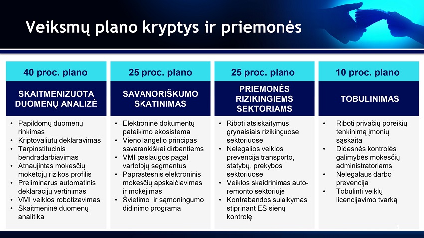 Didžiausią plano dalį – apie 40 proc. – sudaro priemonės skaitmenizuotai duomenų analizei: papildomų duomenų surinkimas, kriptovaliutų deklaravimas, tarpinstitucinio bendradarbiavimo efektyvinimas, mokesčių mokėtojų rizikos profilio atnaujinimas, preliminaraus automatinio deklaracijų vertinimo diegimas, Valstybinės mokesčių inspekcijos (VMI) veiklos robotizavimas, skaitmeninės duomenų analitikos diegimas.
