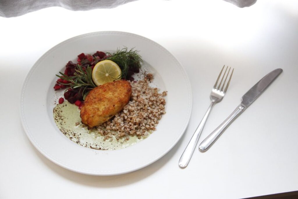 -Menkės kepsnelį, pamyluotą grikiais ir burokėliais