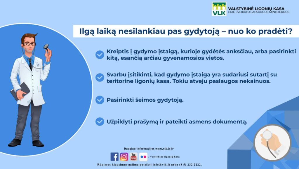 Valstybinė ligonių kasa prie Sveikatos apsaugos ministerijos (VLK) primena, kad kiekvienas privalomuoju sveikatos draudimu apdraustas gyventojas turi teisę kreiptis į tą įstaigą, kurioje kažkada gydėsi arba laisvai pasirinkti kitą gydymo įstaigą, kurioje nori gydytis, ir joje dirbantį šeimos gydytoją, pas kurį nori lankytis.