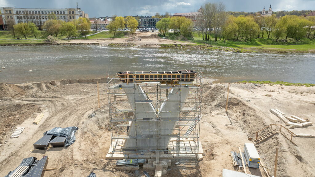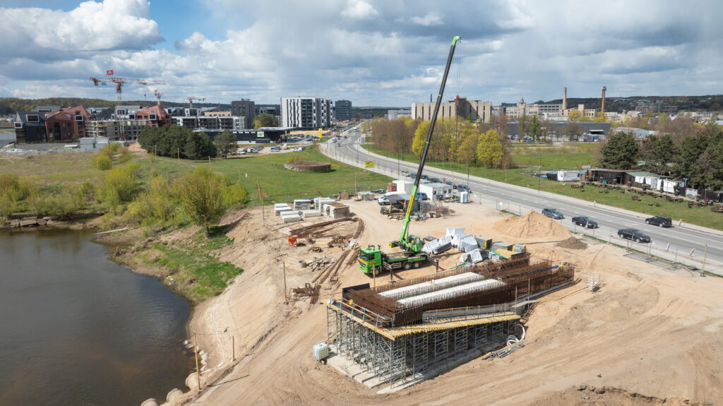 Statybvietėje kone pilnai įrengtos trys atramos. 302 metrų ilgio ir 6,5 m pločio tilto perdanga – gamyboje. Vien jai bus panaudota 961 tona plieno.