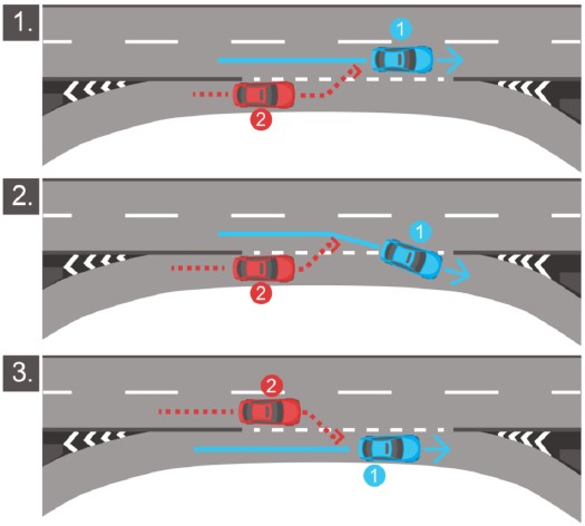 Pagal nuo sausio 1 d. įsigaliosiantį KET 112 punkto pakeitimą, greitėjimo juosta važiuojantis ir į transporto srautą ketinantis įsilieti (persirikiuoti) vairuotojas privalės duoti kelią transporto srautu važiuojančiai transporto priemonei (1 situacija) arba į lėtėjimo juostą persirikiuojančiai transporto priemonei (2 situacija).