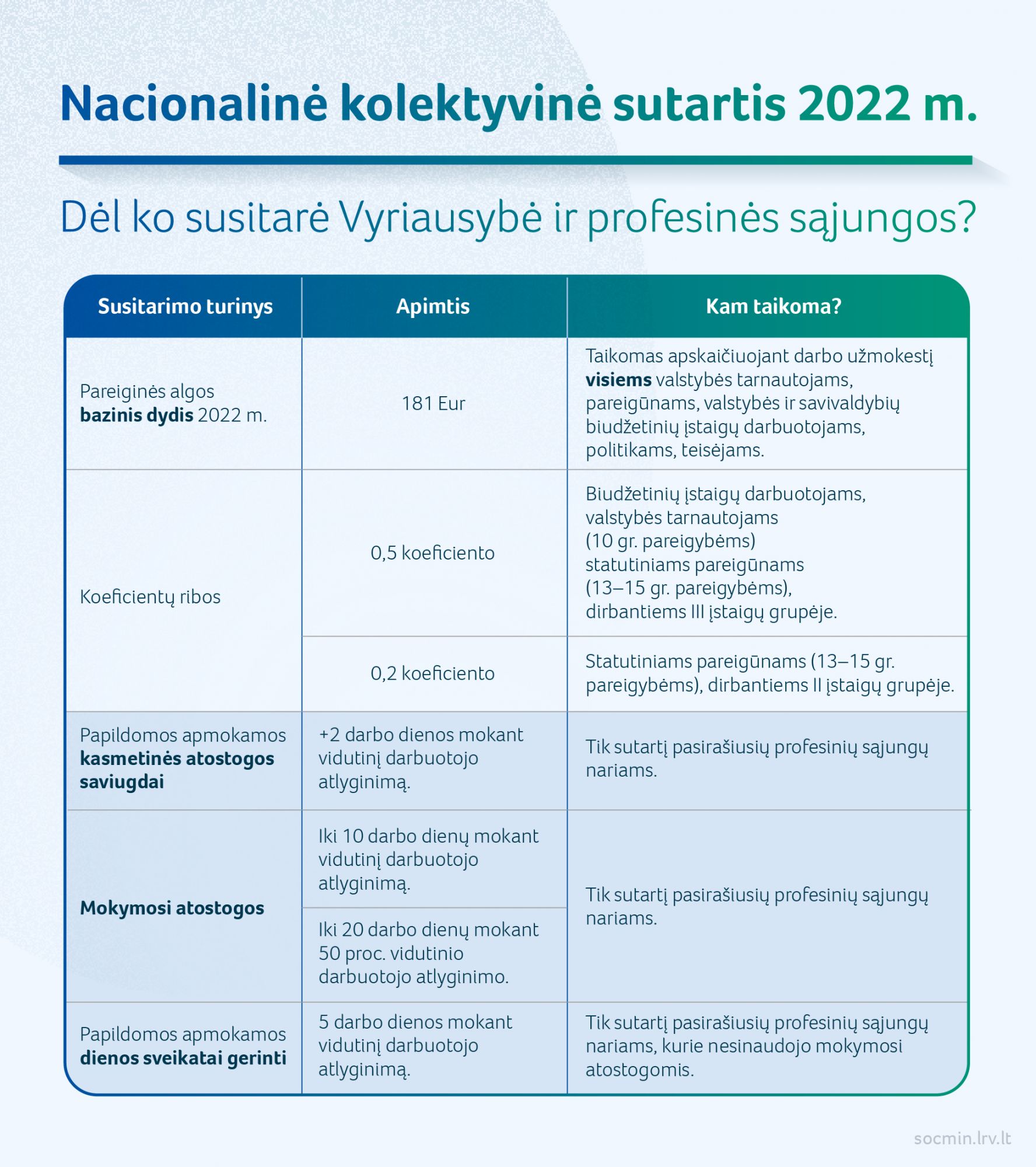 Vyriausybės įgaliota socialinės apsaugos ir darbo ministrė Monika Navickienė bei keturios profesinių sąjungų organizacijos pasirašė Nacionalinę kolektyvinę sutartį 2022 metams. Šalys susitarė padidinti pareiginės algos bazinį dydį visiems viešojo sektoriaus tarnautojams, darbuotojams ir pareigūnams iki 181 euro, užtikrinti geresnes sąlygas mokymuisi ir saviugdai, šių darbuotojų teisę į saugias ir sveikas darbo sąlygas: skatinti įstaigas dirbti be psichologinio smurto, priekabiavimo darbe, numatyti tinkamas priemones ir skirti pakankamą finansavimą psichologinio smurto darbe prevencijai.