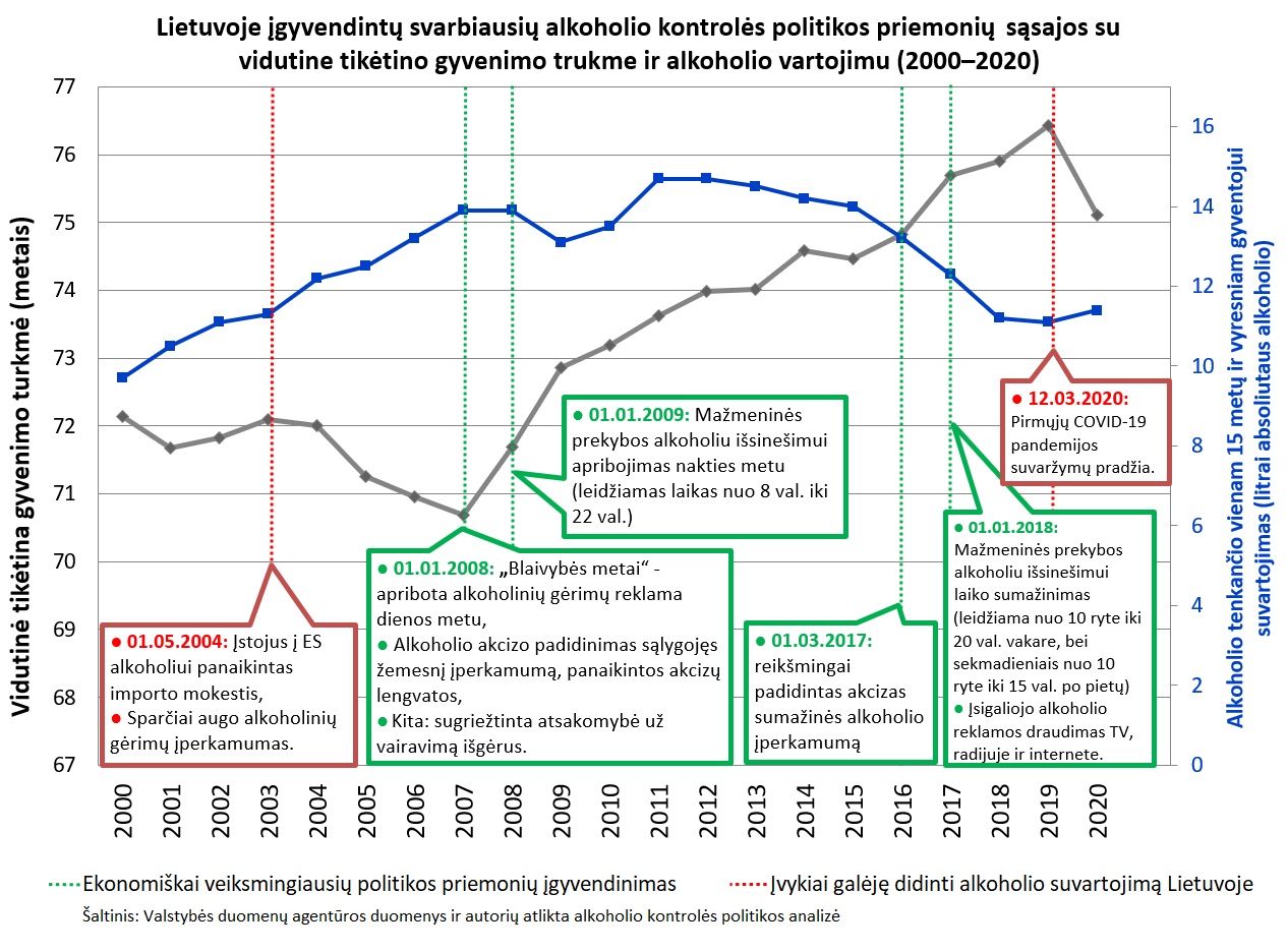 Didžiausią teigiamą poveikį Lietuvos gyventojų sveikatos rodikliams turėjo keturi svarbiausi įvykiai: „blaivybės metai“ 2008 metais, kai padidintas akcizas ir apribota alkoholio reklama dienos metu, 2009 metais apribota galimybė nakties metu įsigytą alkoholį išsinešti, 2017 metai, kai ženkliai padidintas akcizas, ir 2018 metai, kai sutrumpintas prekybos alkoholiu laikas, padidintas alkoholio įsigijimo ir vartojimo amžius iki 20 metų, uždrausta alkoholio reklama.