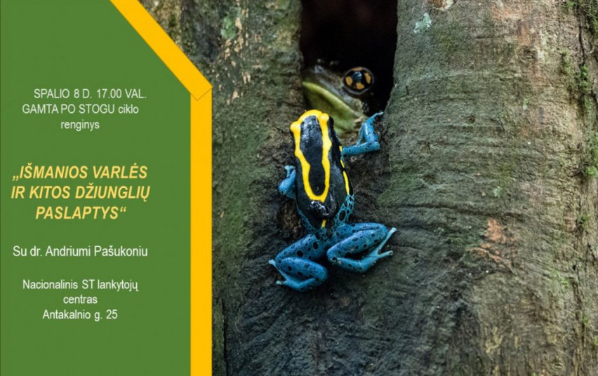 Poryt, spalio 8 d., 17 val. Nacionalinis saugomų teritorijų lankytojų centras kviečia į tradicinio ciklo „Gamta po stogu“, kurį organizuoja Valstybinė saugomų teritorijų tarnyba prie Aplinkos ministerijos, renginį „Išmanios varlės ir kitos džiunglių paslaptys“. Jį ves gamtininkas dr. Andrius Pašukonis, pastaruosius devynerius metus tyrinėjęs Pietų Amerikos varles. Renginys nemokamas. Į jį prašoma užsiregistruoti.