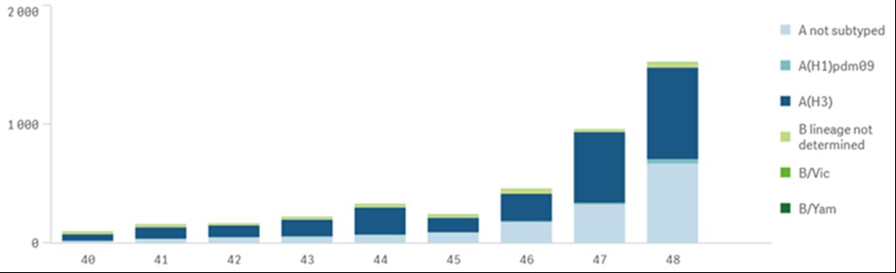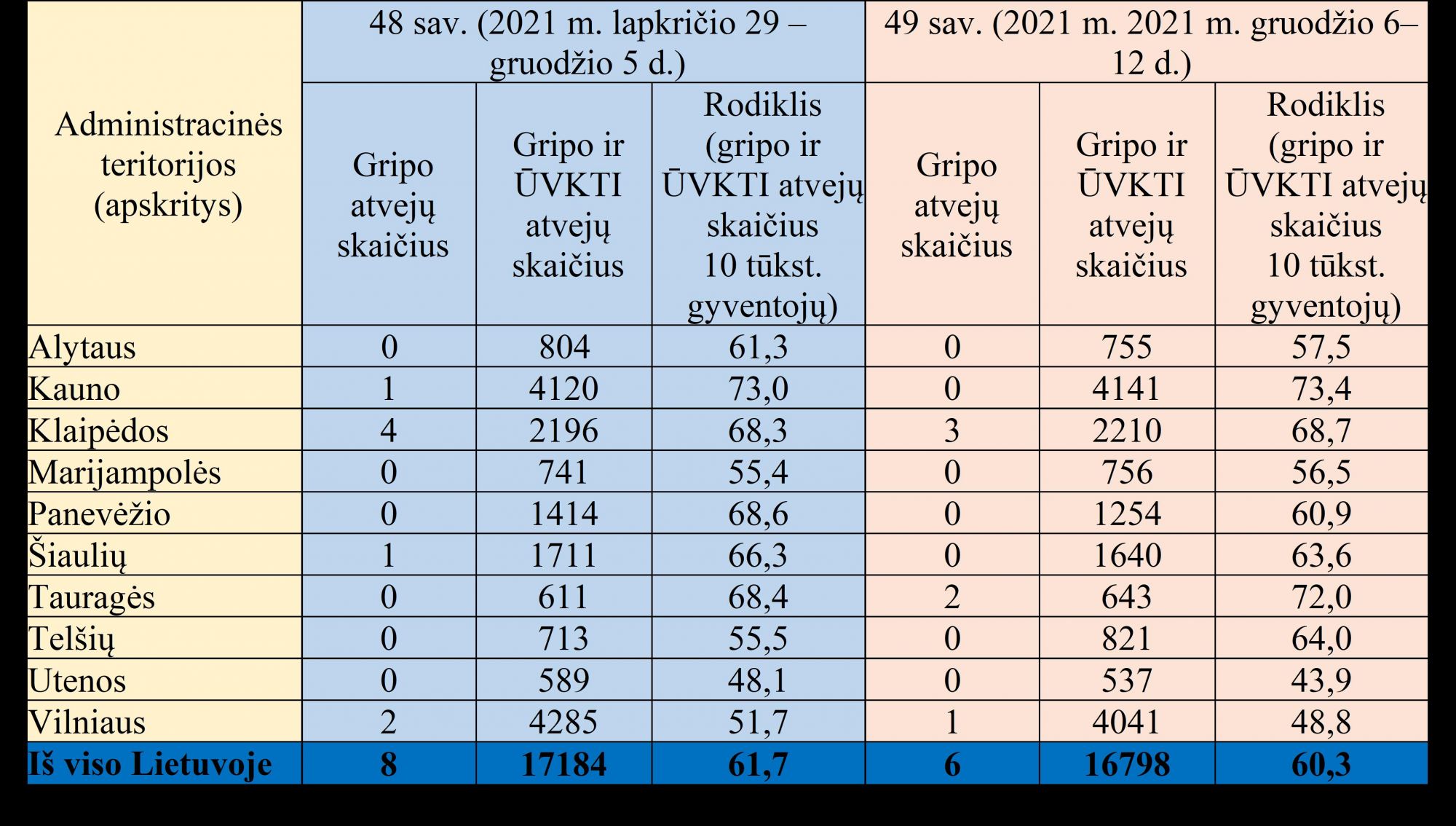 2020–2021 m. gripo sezono 49-ąją savaitę bendras Lietuvos gyventojų sergamumo rodiklis buvo 36,2 atvejo 10 tūkst. gyventojų, o 2021–2022 m. gripo sezono 49-ąją savaitę – didesnis – 60,3 atvejo 10 tūkst. gyventojų.