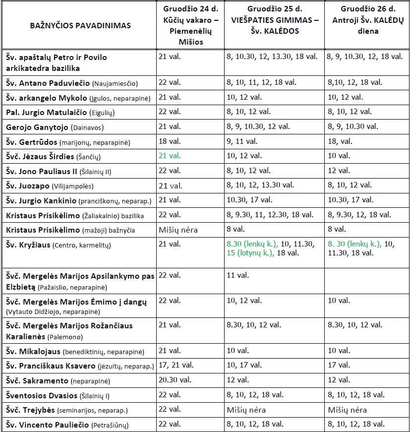 Artėjant Didžiosioms metų šventėms kauniečiams.lt redakcija kviečia pasižvalgyti, kokiu laiku pagrindinėse miesto bažnyčiose vyks Piemenėlių mišios (Kūčių vakaro apeigos) ir Šv. Kalėdų (pirmos ir antros dienos) iškilmės. Sąrašu dalinamės žemiau: