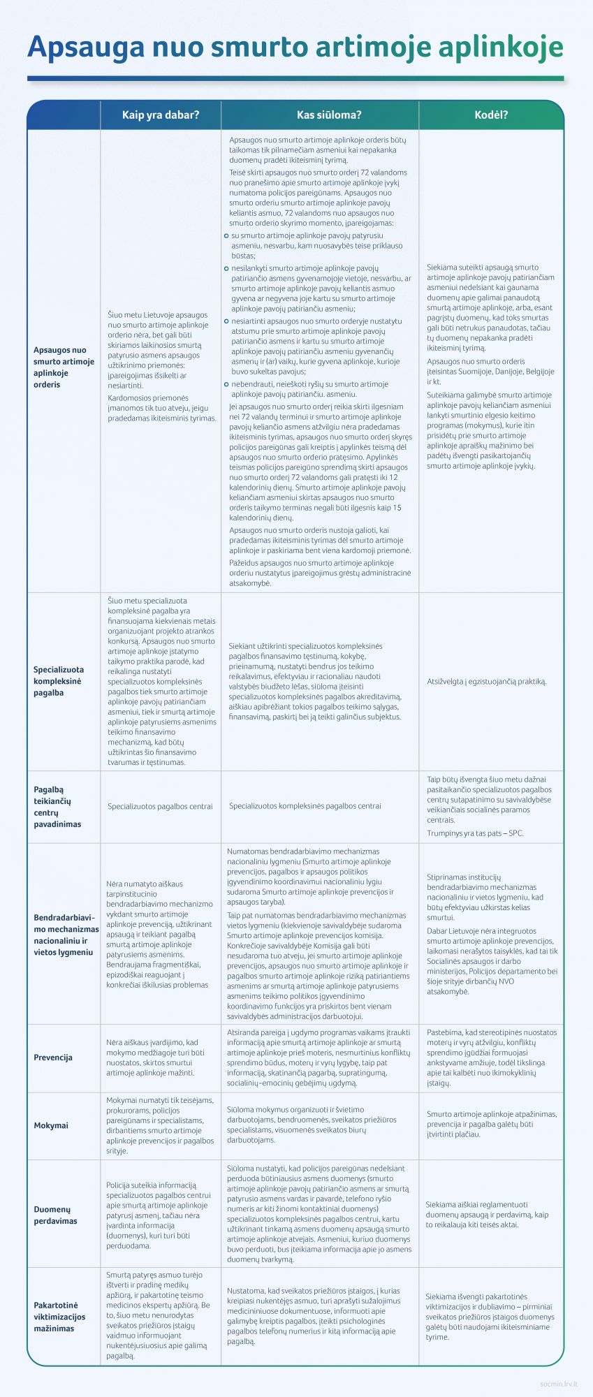 Įstatymo projektu siekiama tobulinti pagalbos teikimą smurto artimoje aplinkoje pavojų patiriantiems asmenims ir smurtą artimoje aplinkoje patyrusiems asmenims. Tai pasiekti padėtų glaudesnis institucijų bendradarbiavimas su nevyriausybinėmis organizacijomis, valstybės ir savivaldos lygmeniu koordinuojama pagalba.