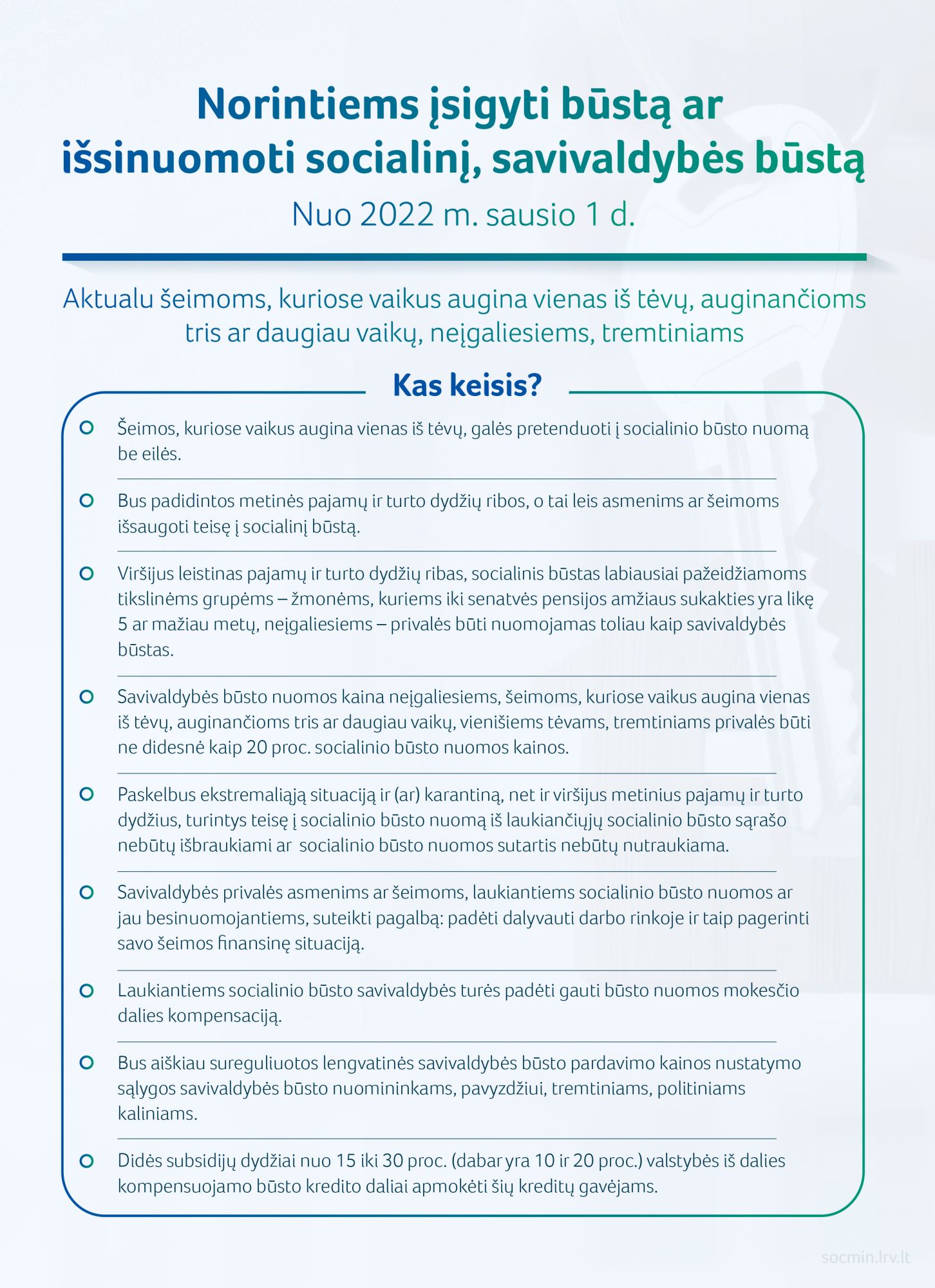 Būstas taps labiau prieinamas šeimoms, kuriose vaikus augina vienas iš tėvų, auginančioms tris ar daugiau vaikų, neįgaliesiems, – Seimas pritarė padėsiantiems tai įgyvendinti Socialinės apsaugos ir darbo ministerijos pasiūlytiems įstatymo pakeitimams, kurie įsigalioja nuo 2022 m. sausio 1 dienos.