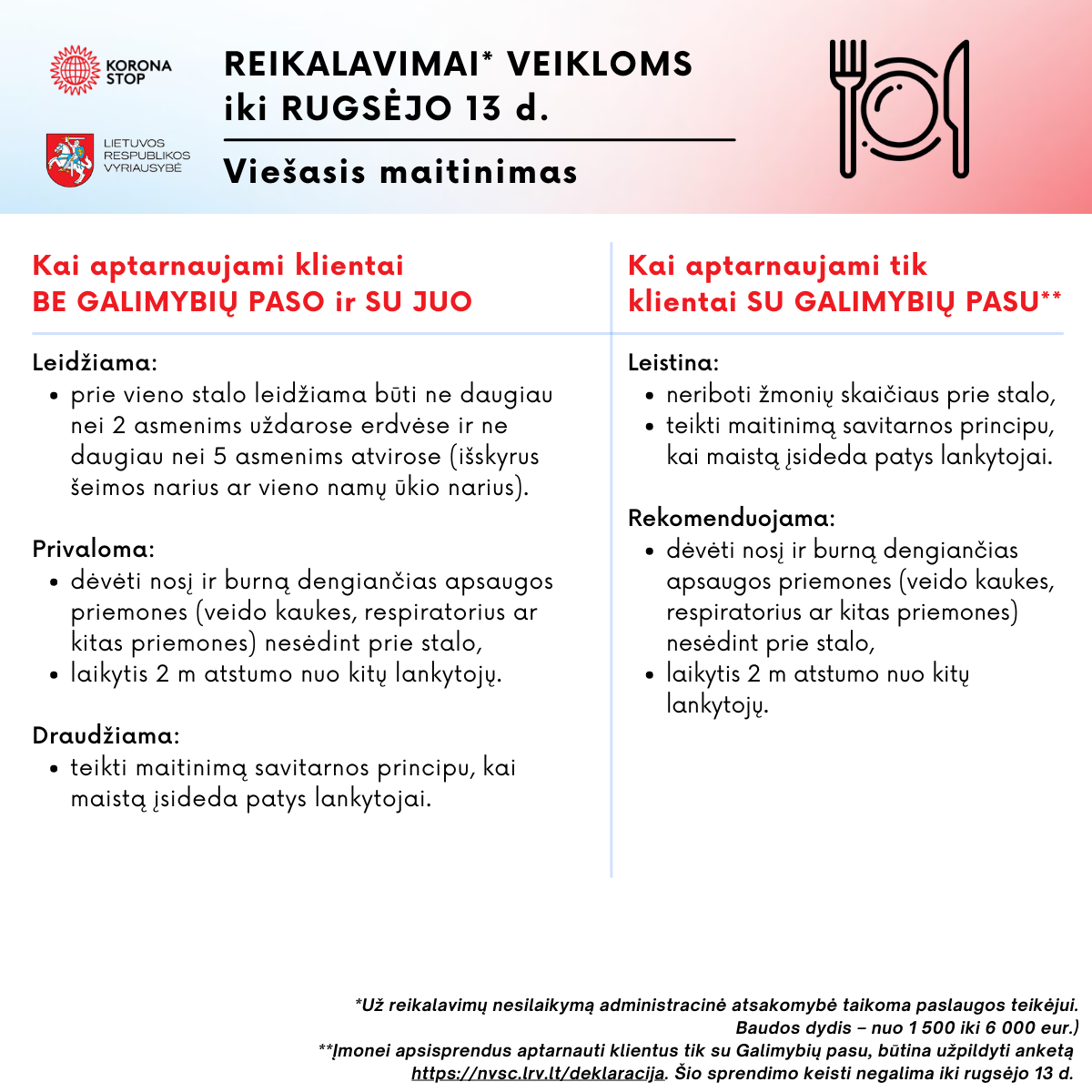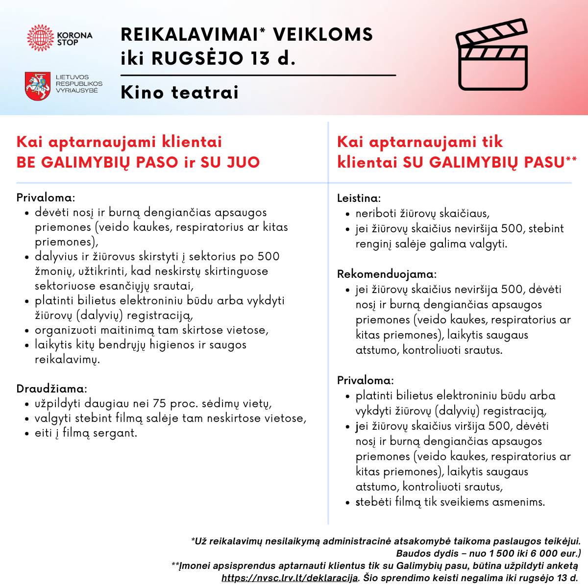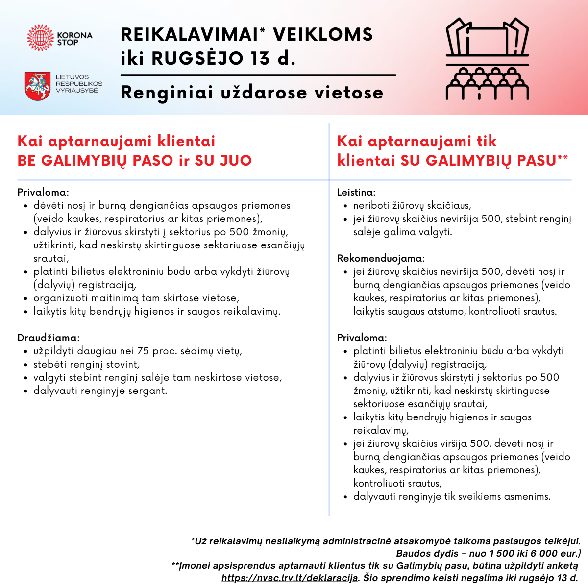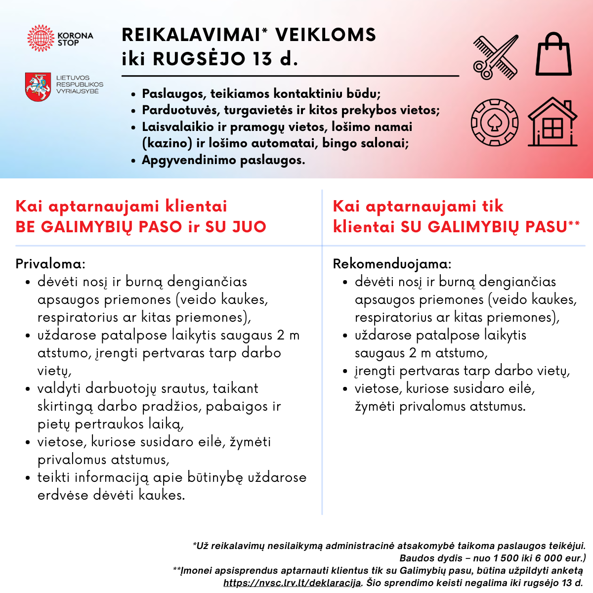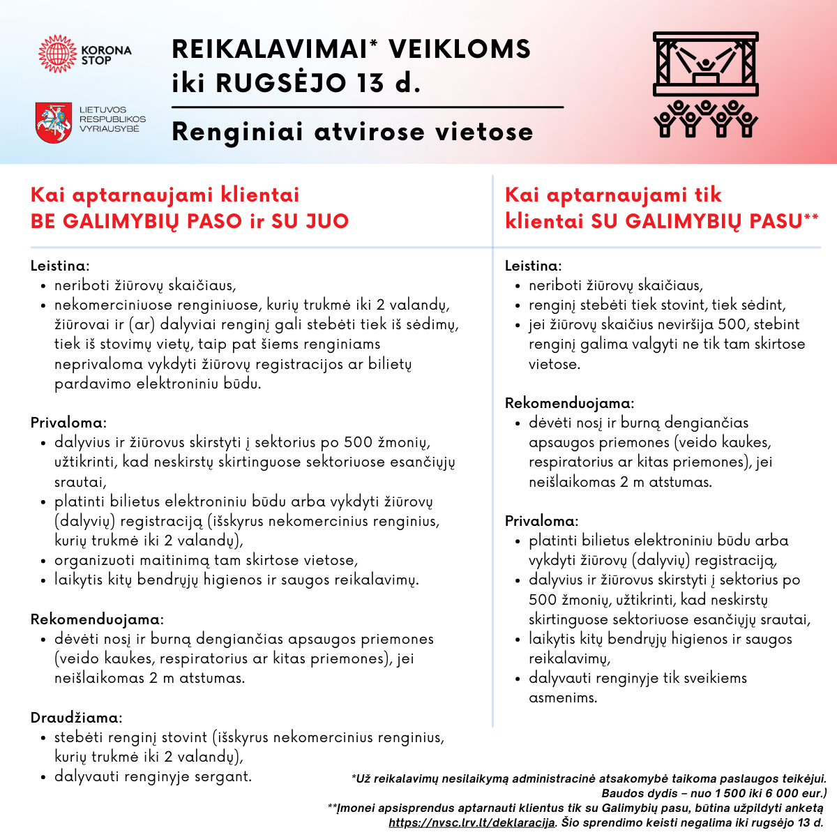 Nuo rugpjūčio 16 d. įsigaliojo reikalavimai įvairioms veiklos: renginiams atvirose ir uždarose erdvėse, kino teatrams, viešajam maitinimui ir kitoms paslaugoms. Teikiame informaciją, kokie reikalavimai taikomi, kai aptarnaujami klientai be Galimybių paso ir su juo, o kokie – kai aptarnaujami klientai tik su Galimybių pasu.