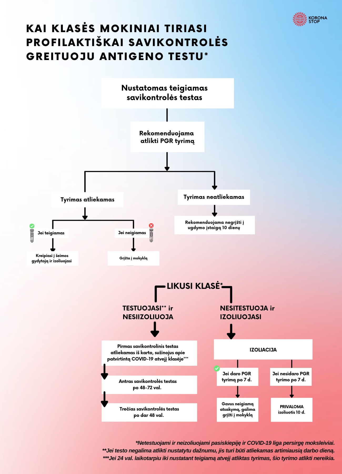 Kaip ir iki šiol, nebus izoliuojami vakcinuoti ir persirgę mokiniai. Kiti ugdytiniai turi pasirinkimą – izoliuotis arba testuotis. Neizoliuojami mokiniai, kurie testuojasi savikontrolės greitaisiais antigeno testais tris kartus: iškart po atvejo nustatymo, antrą kartą – praėjus 48–72 valandoms ir pakartotinai trečią kartą – dar po 48 valandų. Svarbu pažymėti, kad jei neįmanoma išlaikyti nustatyto testavimo dažnumo, galima testuotis artimiausią darbo dieną. Jeigu mokinys yra testuotas 24 val. iki patvirtinto COVID-19 ligos atvejo ar teigiamo kaupinio nustatymo, šis testas užskaitomas, kaip pirmas testas algoritme. Testavimo algoritmas galioja ne ilgiau, nei 10 dienų nuo paskutinės sąlyčio dienos.