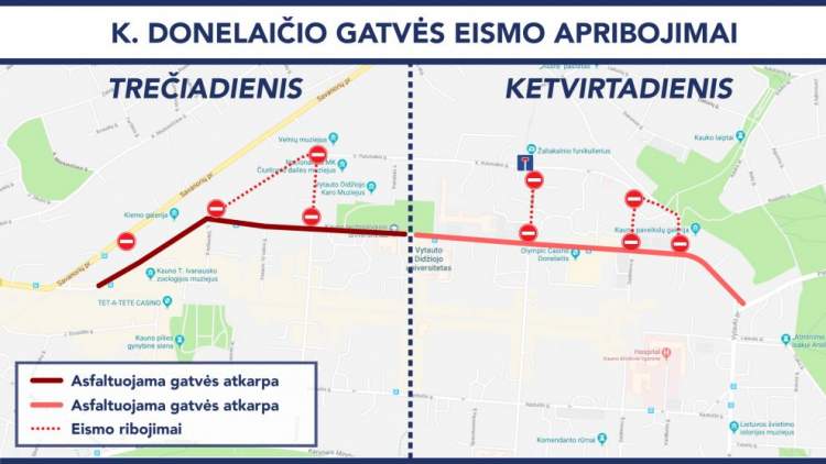 „Į K. Donelaičio gatvę šį trečiadienį nebus galima patekti iš E. Ožeškienės, V. Putvinskio ir Maironio gatvių. Šie eismo ribojimai galios iki 17 valandos”, – teigė A. Pakalniškis.